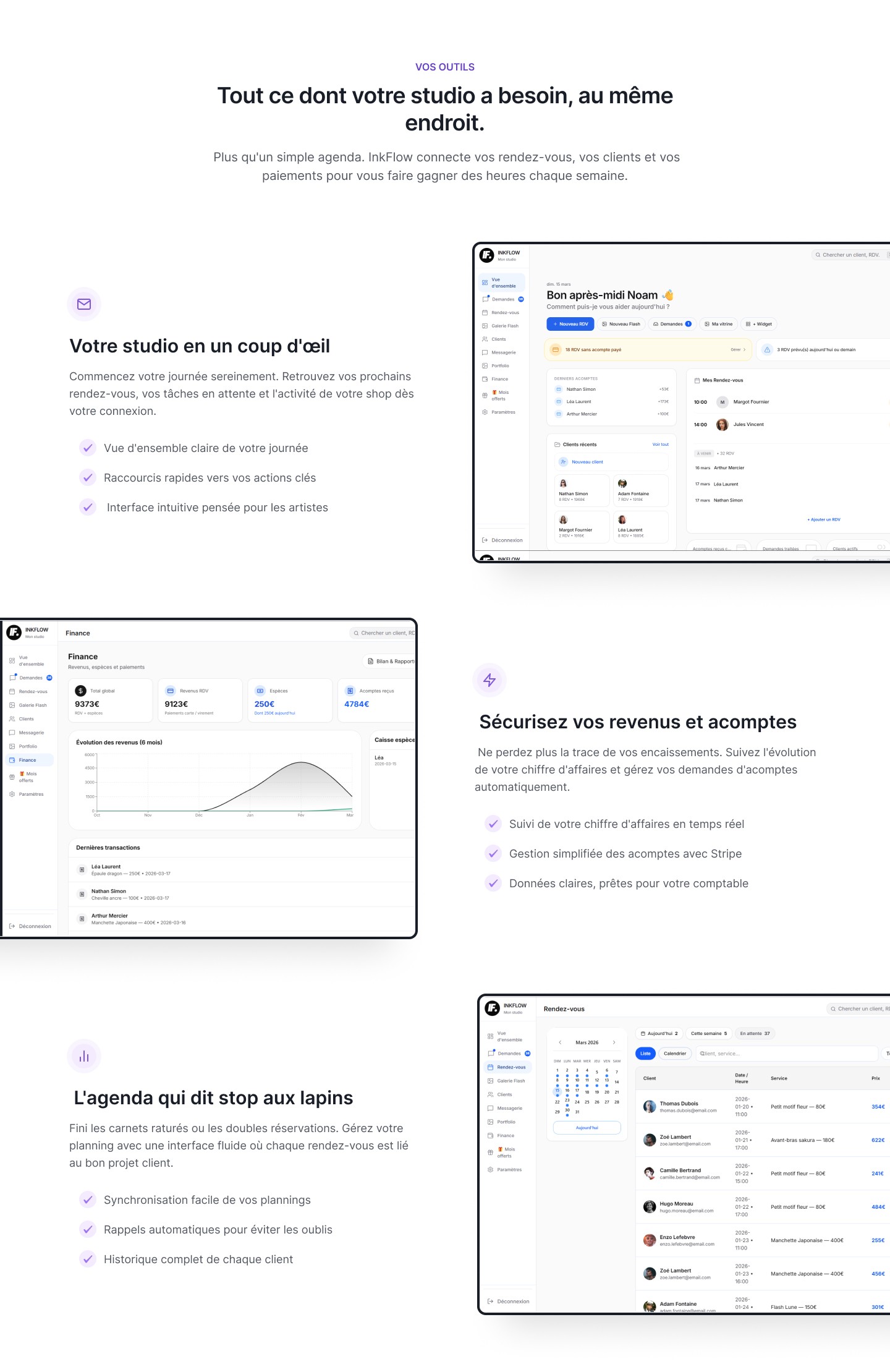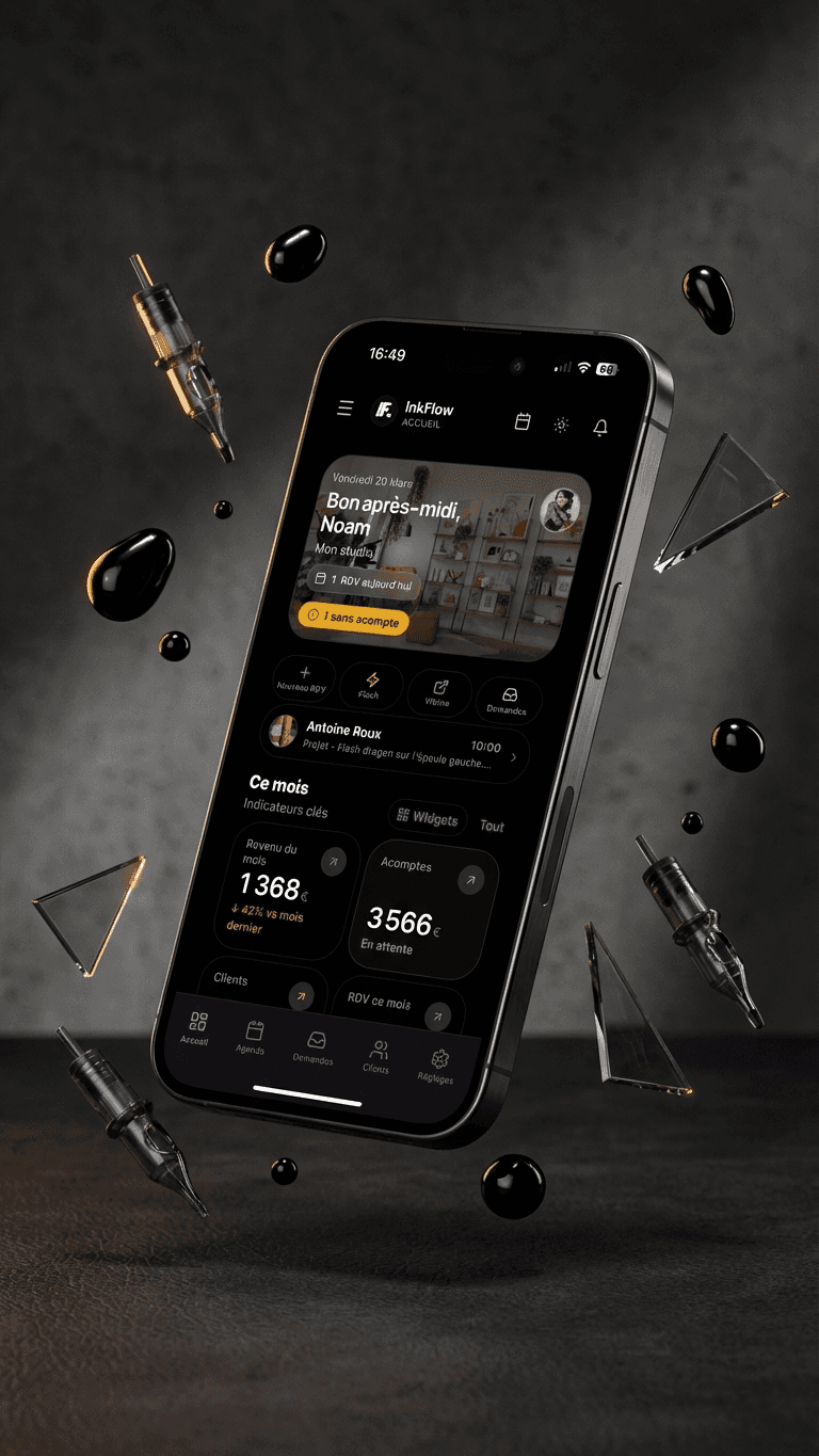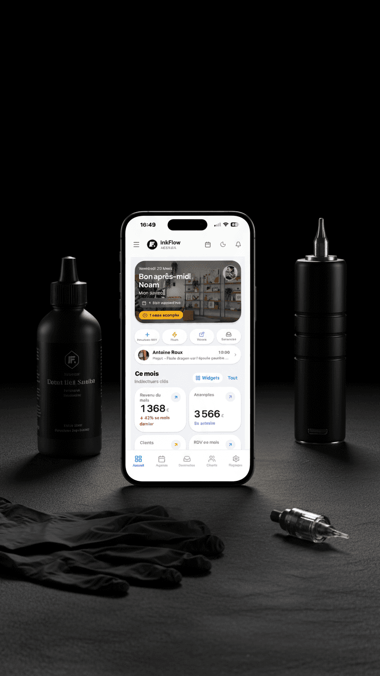 InkFlow connecte votre agenda, vos paiements et vos clients en un seul outil, pensé spécifiquement pour les réalités du métier de tatoueur."
